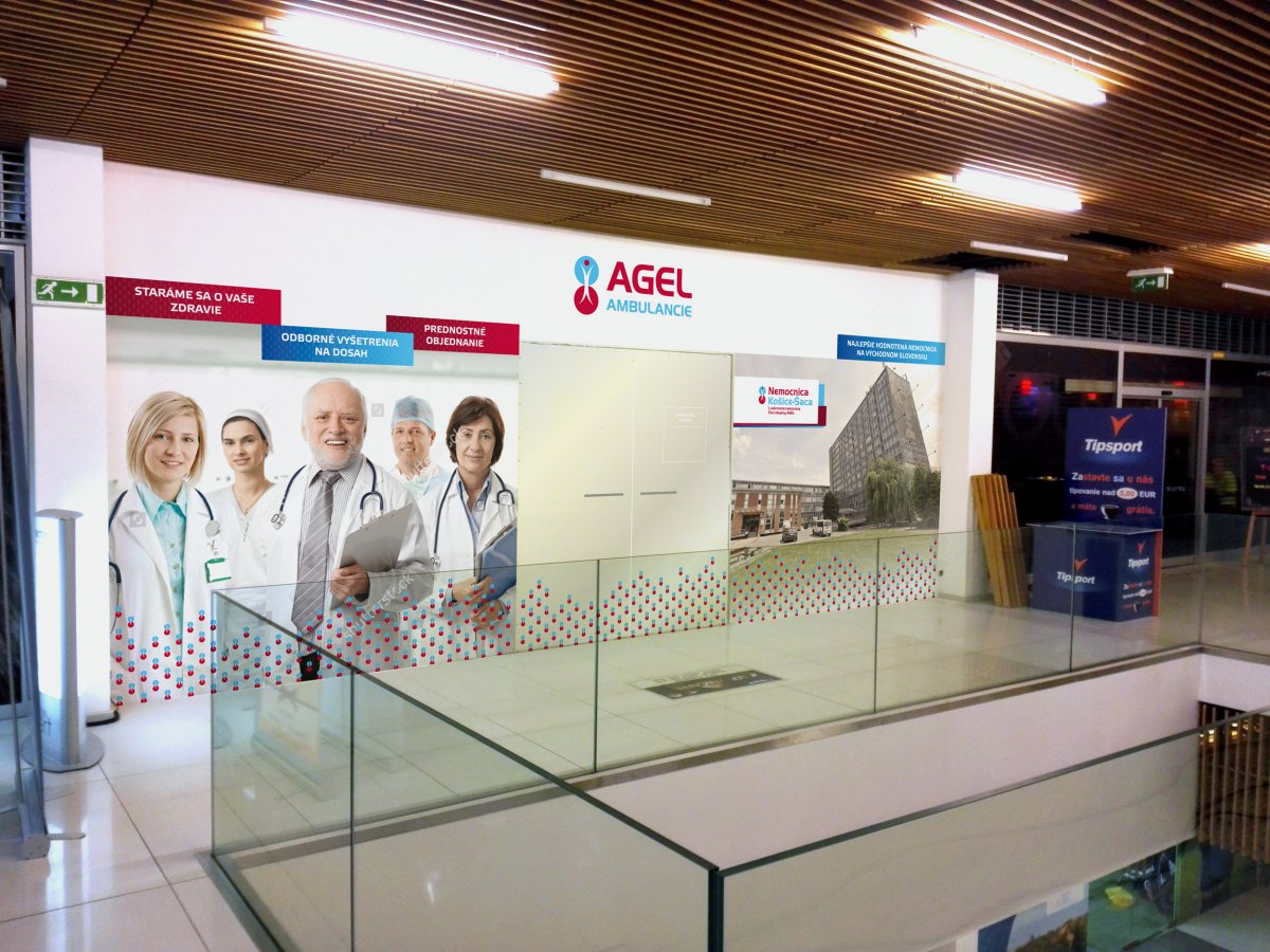 CCG: Keďže spoločnosť AGEL má vlastnú Corporate Identity, tak sme sa pri riešení zadania snažili nielen dôsledne dodžiavať parametre dizajn manuálu, ale aj využiť v ňom navrhnuté charakteristické grafické prvky (makrá). Tie sme umiestnili do spodných častí objektov lekárne, očnej optiky aj ambulancií. Celkovo sme sa snažili, aby grafické návrhy boli synergické a celková komunikácia v rámci Cassovaru bola ľahko identifikovateľná. V rámci zlepšenia komunikácie jednotlivých objektov v priestoroch Cassovaru sme navrhli polep rámu schodiska eskalátoru a umiestnenie rohože s logom pred eskalátor vedúci ku ambulanciám na I.poschodí.