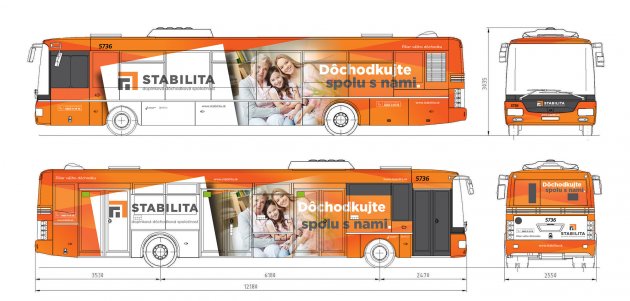 Grafický návrh celopolepu autobusu, realizácia. Ukážky grafík na reklamných nosičoch a propagačné materiály.